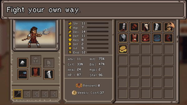 Any skill, armor or weapon is usable by any gladiator, generating lots of possibilities when it comes to creating new builds.
